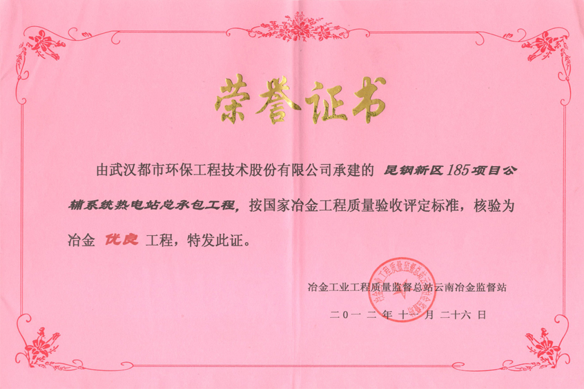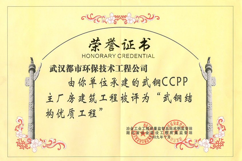 武钢结构优质工程荣誉证书