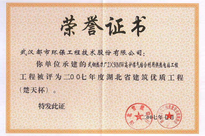 武钢热力厂高炉煤气综合利用供热电站工程(证书)